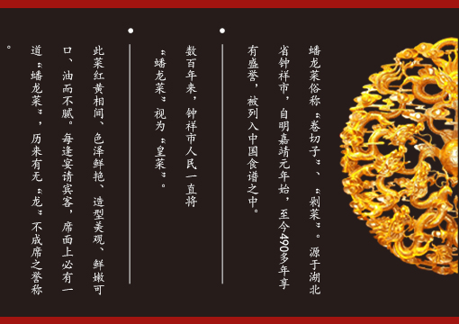 蟠龍菜創(chuàng)于湖廣安陸州(今湖北鐘祥市),鐘祥地區(qū)人們逢年過節(jié)、婚喪嫁娶離不開的傳統(tǒng)名菜,被列入中國食譜之中,是鐘祥地區(qū)名優(yōu)土特之一。公司多年來保留古法工藝精髓,致力于生產(chǎn)、加工、改進蟠龍菜,產(chǎn)品得到市場的一致好評與肯定。
